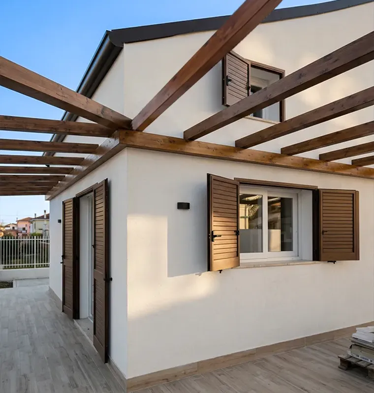Infissi interni in PVC e persiane in alluminio effetto legno.