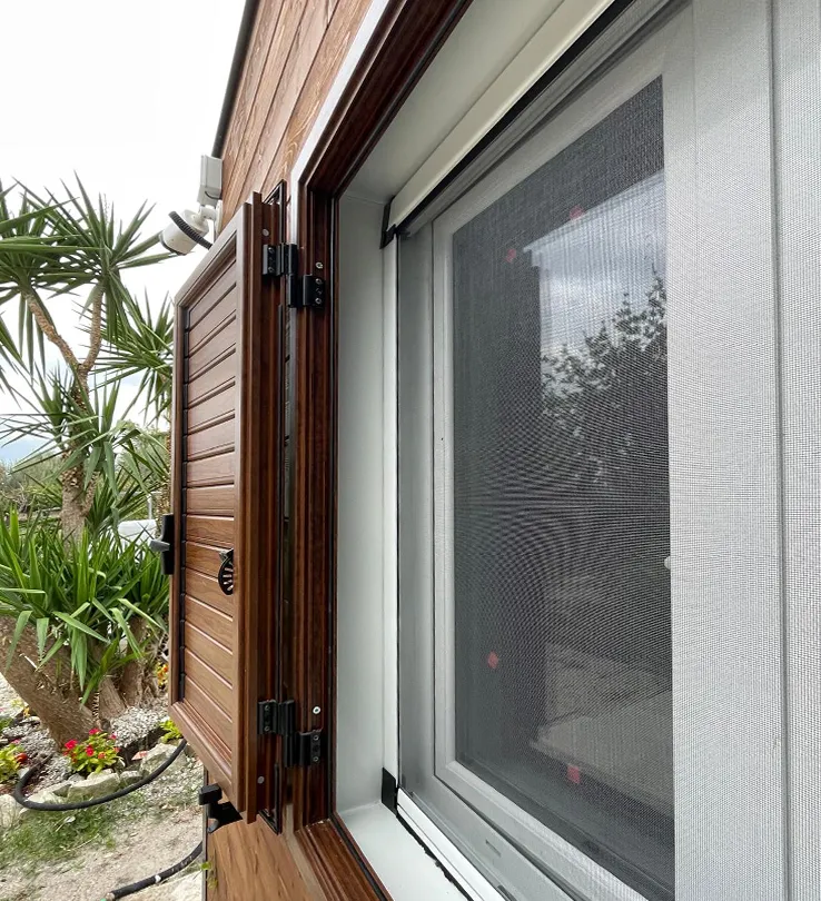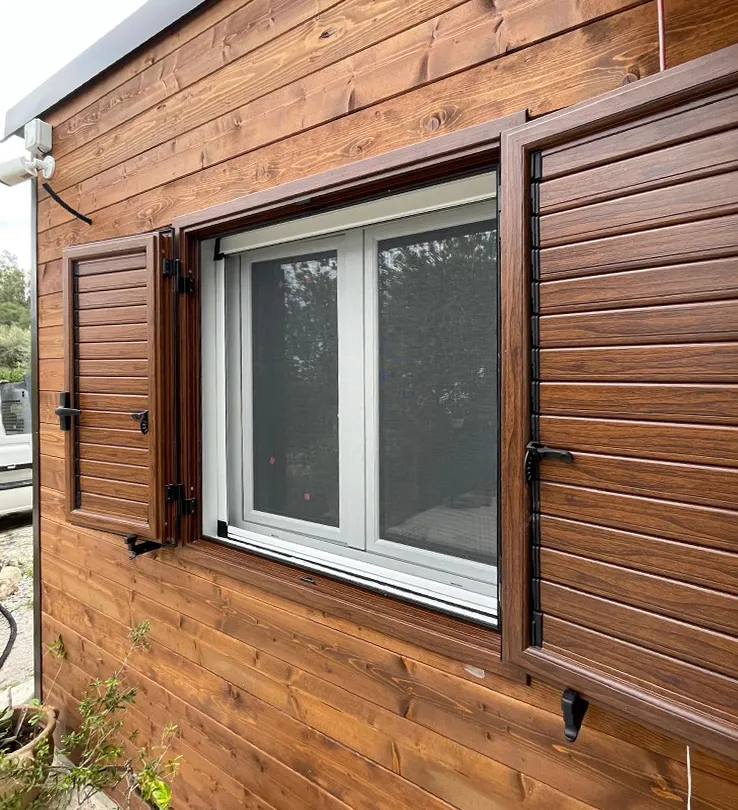 Prefabbricato con infissi in pvc bianco e persiane alluminio noce reale
