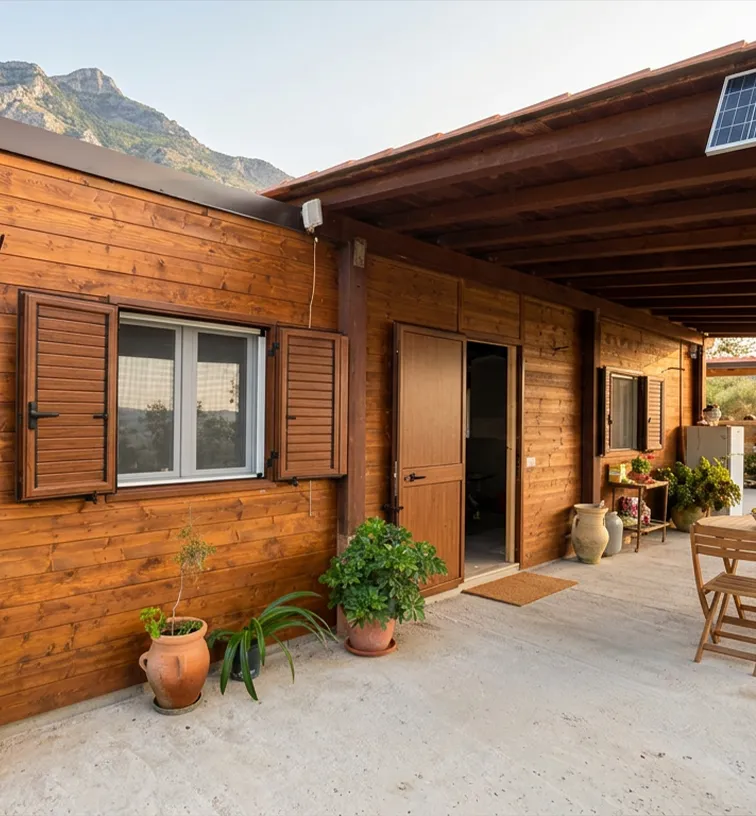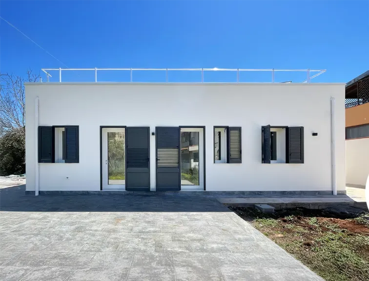 Prefabbricato con infissi in PVC bianco e persiane alluminio