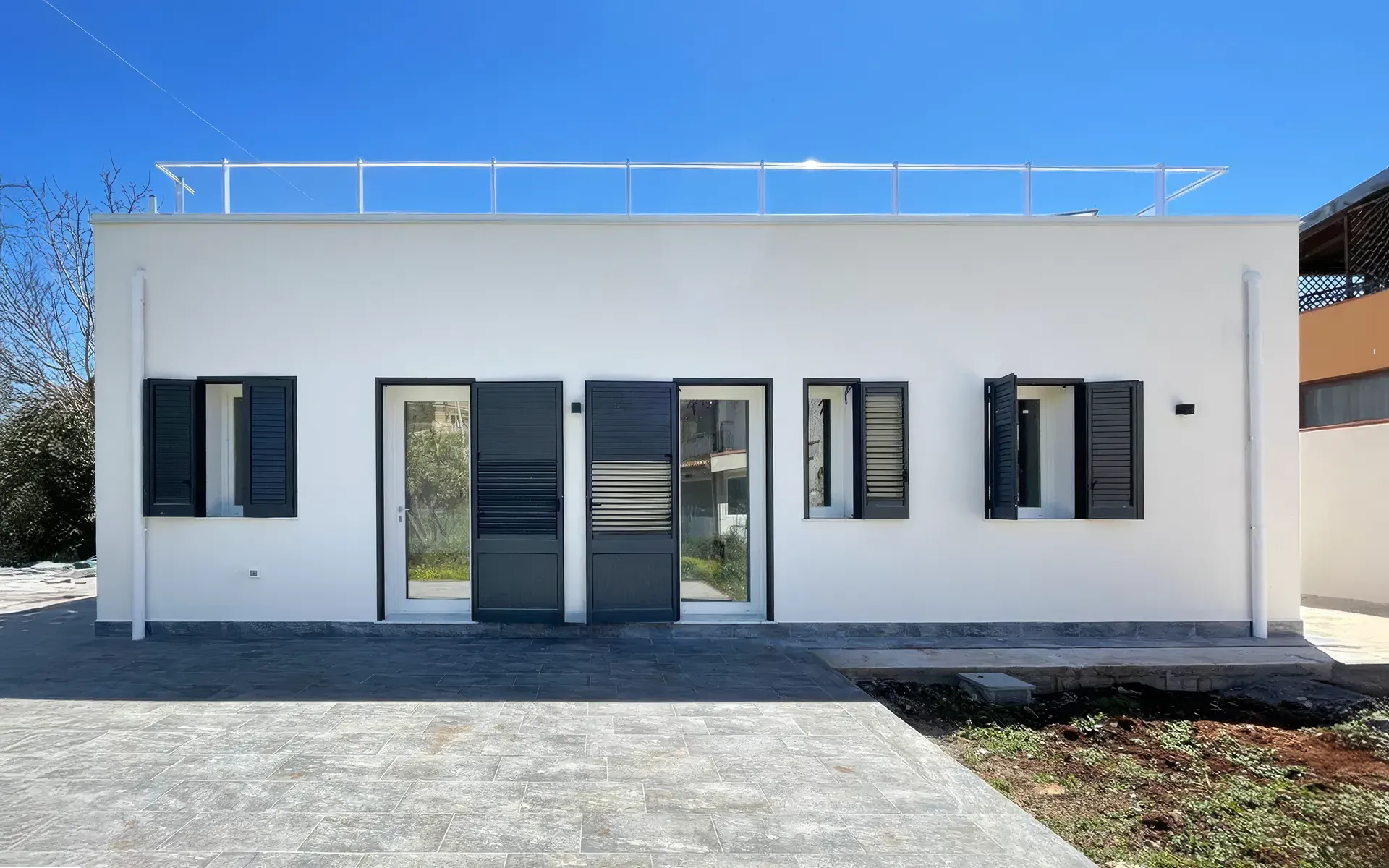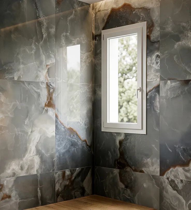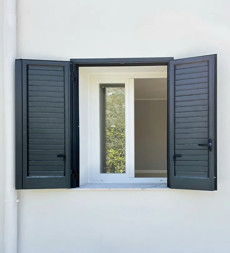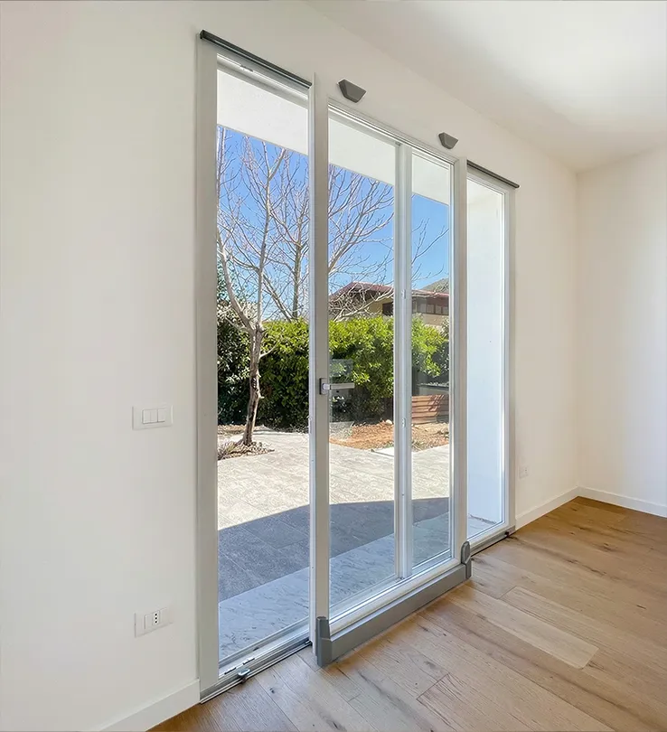 Un progetto che unisce tecnologia d’avanguardia e moderna eleganza. Abbiamo optato per infissi in PVC con apertura a battente e un portoncino d’ingresso coordinato in vetro e PVC. La particolarità tecnica risiede nell’adozione dello scorrevole parallelo con sistema anti-ribalta, che garantisce estrema facilità di manovra e ventilazione sicura. Per l’oscuramento, sono state scelte persiane in alluminio nella raffinata tonalità “grigio gotico” con lamelle orientabili per una gestione precisa della luce.